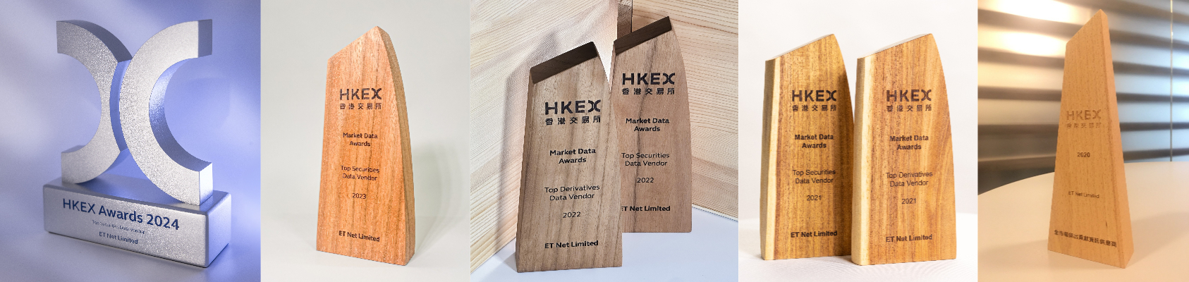 | 香港交易所市場數據大獎 | | 最佳證券數據供應商 (2022-2024) | | 最佳證券數據供應商 (2023)(2022) | | 最佳表現衍生產品數據供應商 (2021)(2022) | | 最佳表現證券數據供應商(2021) | | 全市場傑出貢獻資訊供應商 (2020) | |