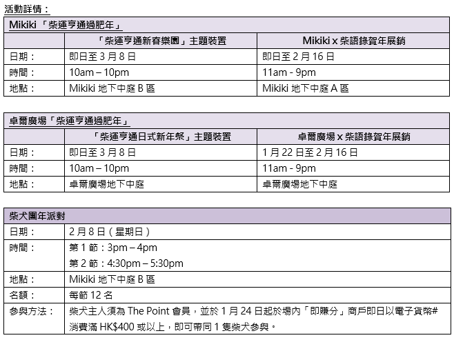 Mikiki 將呈獻「柴運亨通新春樂園」,為您打造歡笑滿載的賀年盛會!您可與人氣爆燈的「柴犬」見面互動,暢玩6大新春主題打卡及遊戲區,沉浸於福氣滿滿的節日氛圍。The Point 會員即日消費滿指定金額即可參加遊戲,成功過關即可獲贈《柴語錄》小禮品1份。