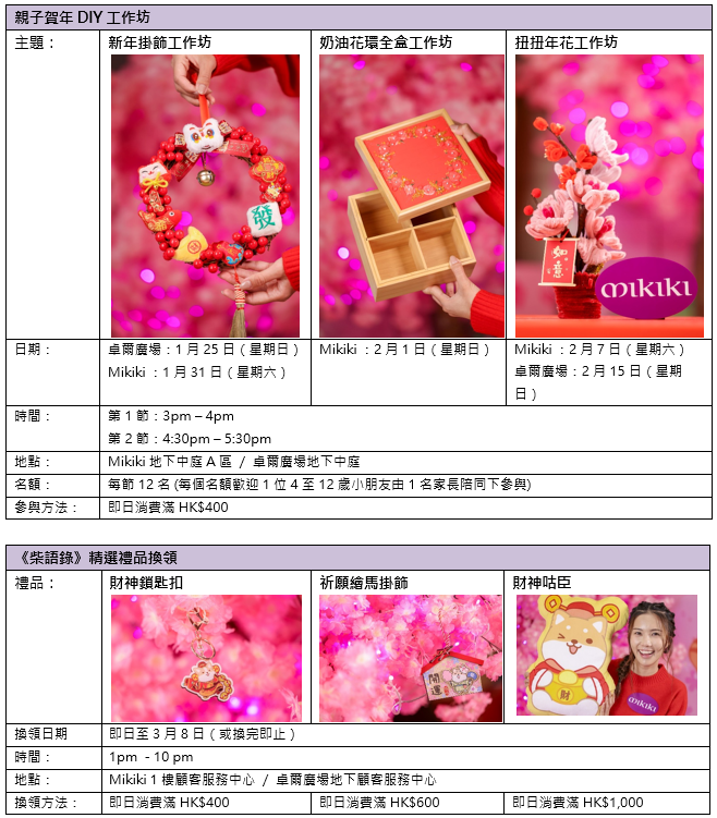 人氣滿滿的《柴語錄》財神將親臨商場與大家喜迎新歲!1月24、25日於Mikiki登場,1月31日及2月1日則移師卓爾廣場與各位見面,記得前來與財神合照沾福氣,粉絲切勿錯過!此外,兩大商場亦將舉辦多場新春賀年DIY工作坊,包括「新春掛飾工作坊」、「奶油花環全盒工作坊」及「扭扭年花工作坊」,讓您與親友一同動手創作獨一無二的節日作品,共享溫馨手作時光,迎接福氣滿滿的新一年。The Point會員只需於場內「即賺分」商戶消費滿指定金額即可報名參與。