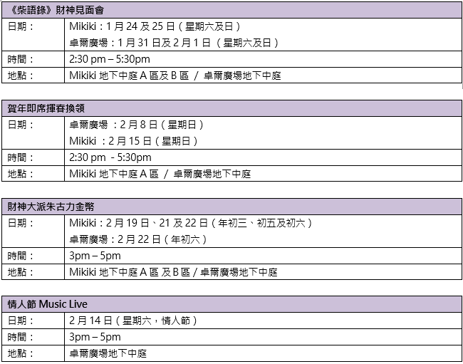 兩大商場更特備連串精彩新春活動迎佳節,包括《柴語錄》財神見面會、消費換領《柴語錄》精選賀年禮品、「柴犬團年派對」、書法大師即席揮春、新春親子DIY工作坊、財神大派朱古力金幣等,與大家共迎喜氣洋洋的馬年!