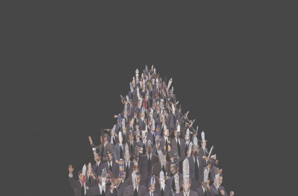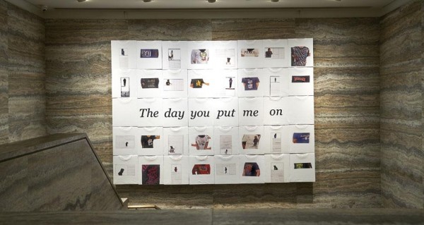 展覽裡,不論新舊作品皆有。在會館裡先聲奪人,為來賓奉上視覺衝擊的是四十件整齊地密鋪在牆上的白色T恤,Jims 形容這幅作品似是模仿那些旺角街邊販賣T恤擋攤的陳列格式。葉建邦抽起了報紙裡的文字,卻保留了報章的排版設計和照片,若只靠這兩種視覺元素,不同國藉的人都能看懂內裡的時事內容嗎?葉建邦並沒有胡亂選幾宗新聞為題材,他篩選了強姦犯當場被補時的人像,抽起文字,研究犯人當時身穿的T恤會否早早已揭示他會犯案行兇。普通一件T恤,其實已經反映你的個性喜好,代表你的意見立場,若要宣揚一己想法,有甚麼比這將之掛於胸前,遊街示眾,更直截了當?