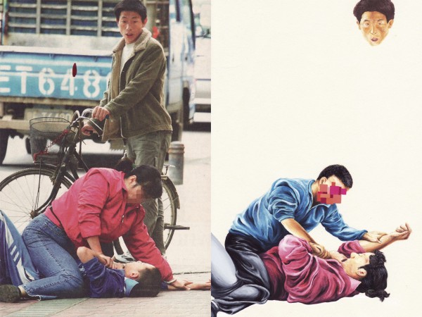 緊隨其後,在偏廳裡掛有林愷倩的畫作和宋拓的字畫。在封閉的房間,可以細賞兩位精細的作品。林愷倩把她從新聞照片所意會到的揮筆畫下來,有時會變成一個簡化版,而有時卻是同樣細緻,但物件的本質或是位置大有不同。再將照片與畫作併放一起,惹人遐想的空間甚廣,趣味盎然。而在場唯一一件包含「文字」的展品是來自宋拓的字畫。加上引號是因為他自創別樹一幟的字型會令人難以辨認,而有些字句拼湊為一個段落,則使人看得似懂非懂。兩種創作手法不同,觀者賞析時的節奏、角度以及深度定必受影響,正好可以了解自己閱讀藝術的習慣。