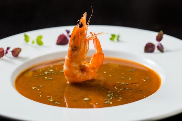 法式海龍皇湯以多款鮮魚入饌,加入紅蘿蔔、洋蔥、蕃茄、西芹及白萄葡酒等材料,熬成濃郁鮮甜的湯底,最後配上爽口原隻冰島大蝦,口感層次豐富。